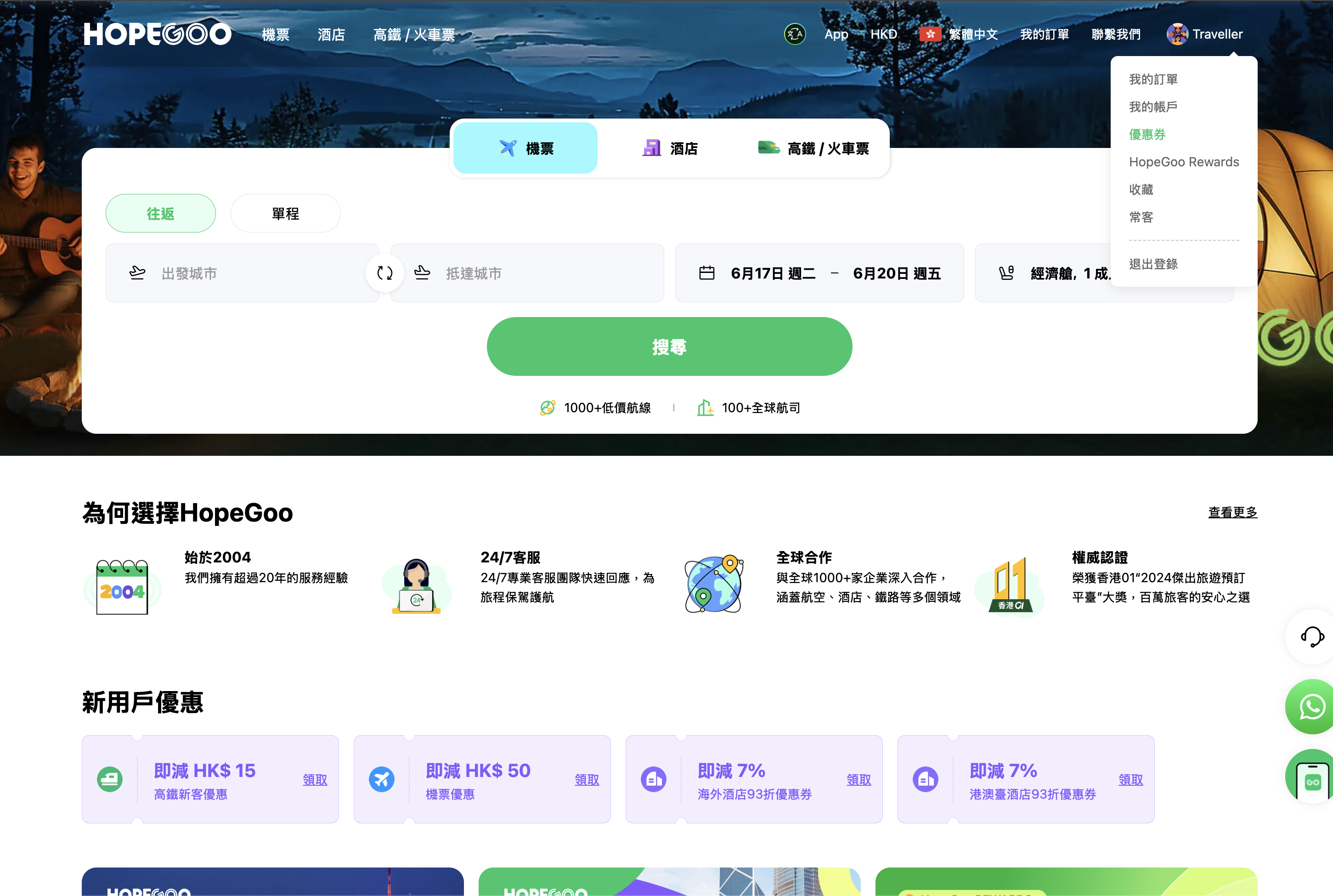 HopeGoo新客機票優惠券:國際航班消費滿港幣999元,可減港幣120元